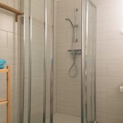 - Badezimmer mit ebenerdiger Dusche und Fenster